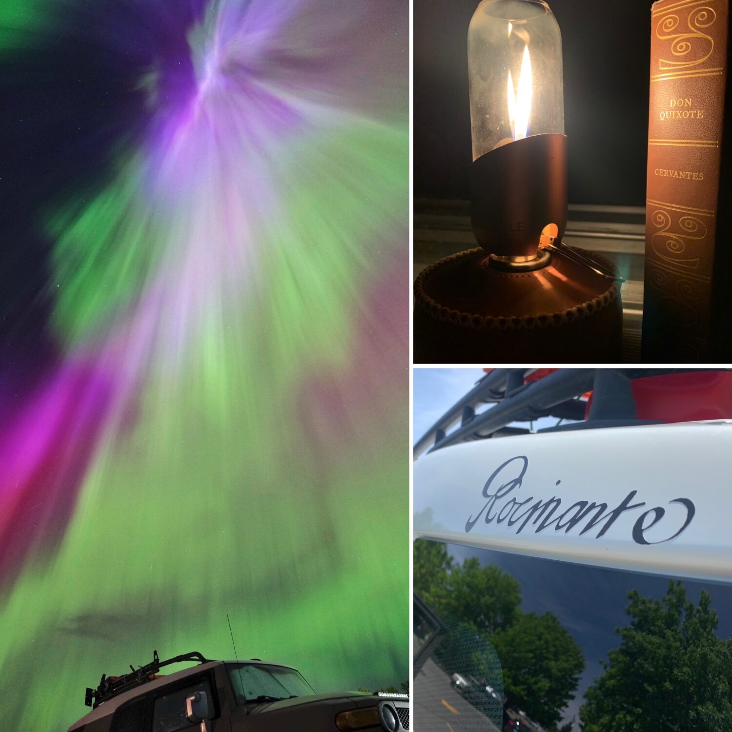 Clockwise from left: Auroral Burst at Fraser Lake, British Columbia, reading by lantern off Highway 37 in BC, Rocinante’s new vinyl nametag in Ellensburg, Washington. - The Cassiar Highway is one long stretch of nothing. 700 kilometers lacking many services, nearly any attractions, and certainly no cell coverage. Mileage signs suggest that towns exist along its path other than Dease Lake, but most signs merely give you distances to little more than highway maintenance sheds with no commercial services. Although I truly enjoyed exploring the ruins of Cassiar and the abandoned asbestos mine as well as an expansive wasteland created by a recent forest fire, the rest of the road was shrouded in early spring fog until I turned off toward Prince George. Perhaps the various dead-end roads to other communities might have something, but the main road is very lonely.
