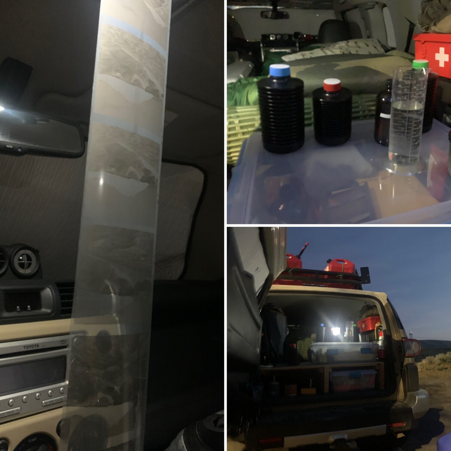 - Developing film remotely was a bigger hassle than I thought it would be. Although Rocinante was fully outfitted with a portable darkroom to develop and scan my 35mm and 120 film remotely without need for a darkroom, running water or wastewater collection, I quickly realized I had underestimated just how many containers I needed to capture waste material. While chemicals were certainly collected, waste rinse water was one that I initially did not consider and had to hastily make up for. After doing it remotely once, I decided my developing would be relegated to hotel rooms from now on. Even so, I had also failed to prepare a method to hang dry my film after processing and my MacGuyvering techniques left a lot to be desired. Scanning, however, was a much less stressful process because I had brought along a collapsible, cardboard Kodak Medium Format Scanner that I had recently purchased for my program to address students shooting film in the bush / remotely. Note that the link provided is for a 35mm one, the 120 version seems to have disappeared off Amazon; however: at $40 it is exactly the type of scanner you get for that price and was absolutely perfect for my need for portability – scans at 12 megapixel due to my phone’s limitations, but far more than needed for social media posts along the road.
